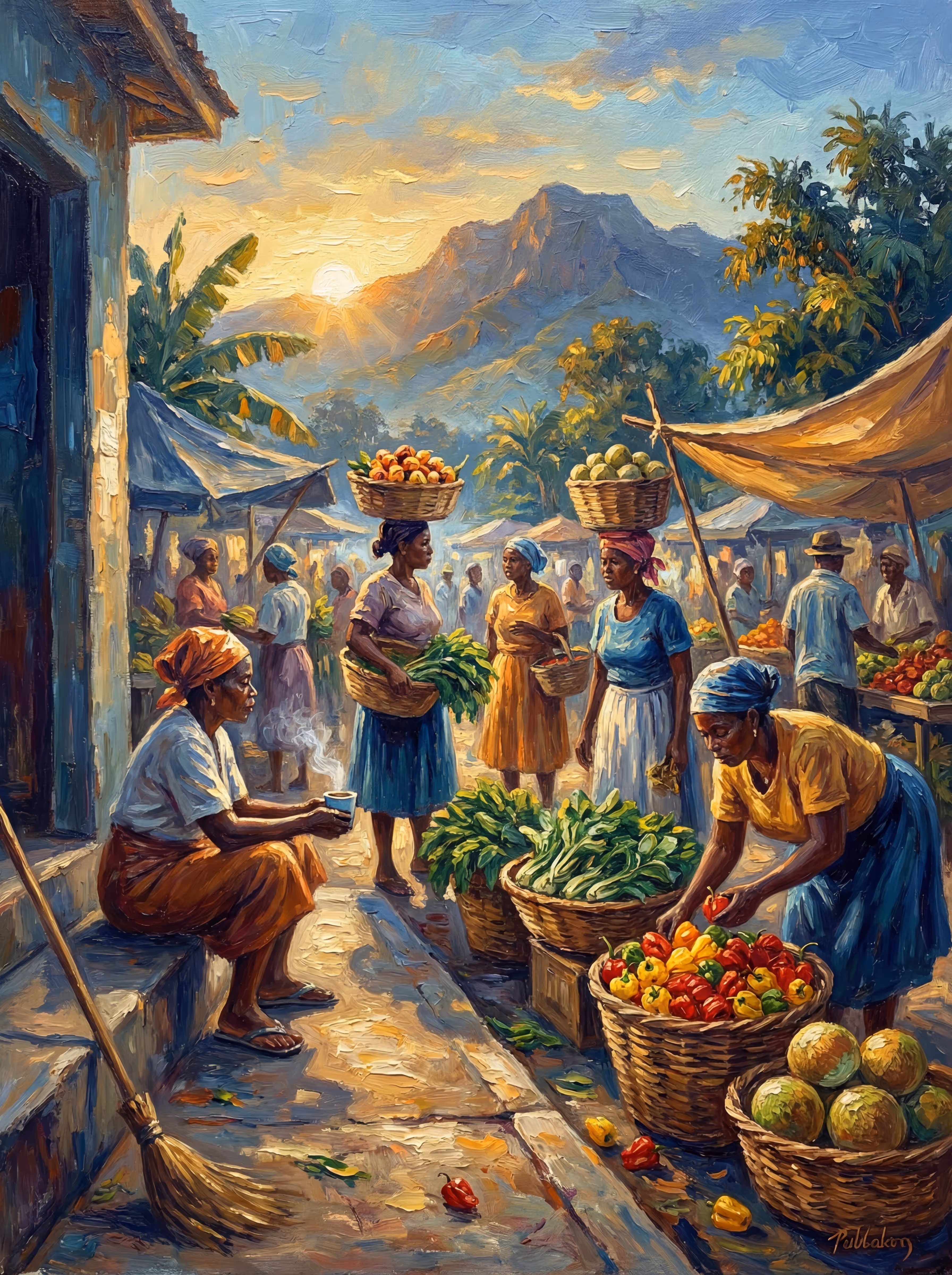 Morning develop slow, like a photograph in solution. Blue Mountain first, then the rooftops catch it, then the sea start pulling colour out of nothing. Somebody grandmother already sweeping the front step. The street smell like mint tea and wood smoke and the day don’t start good yet.