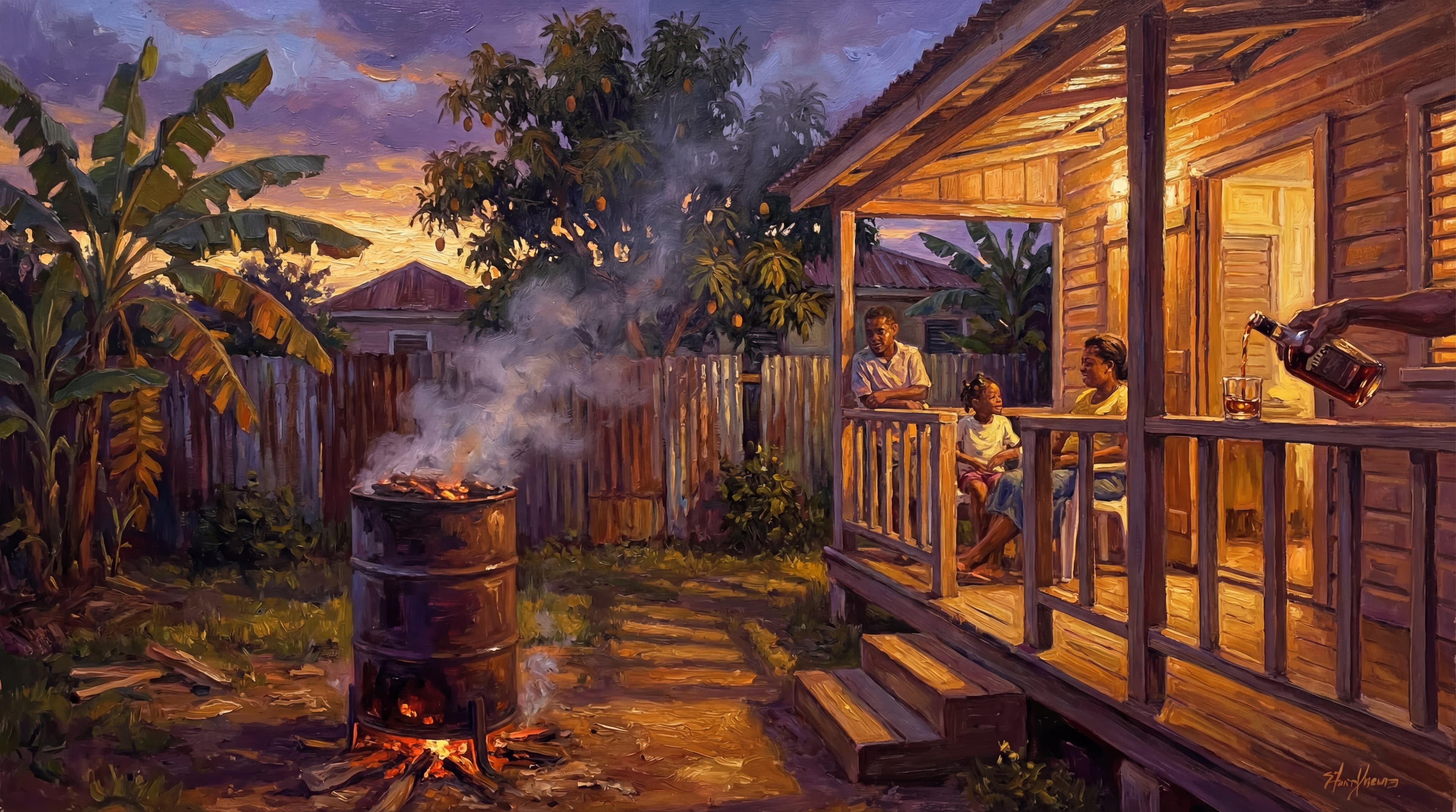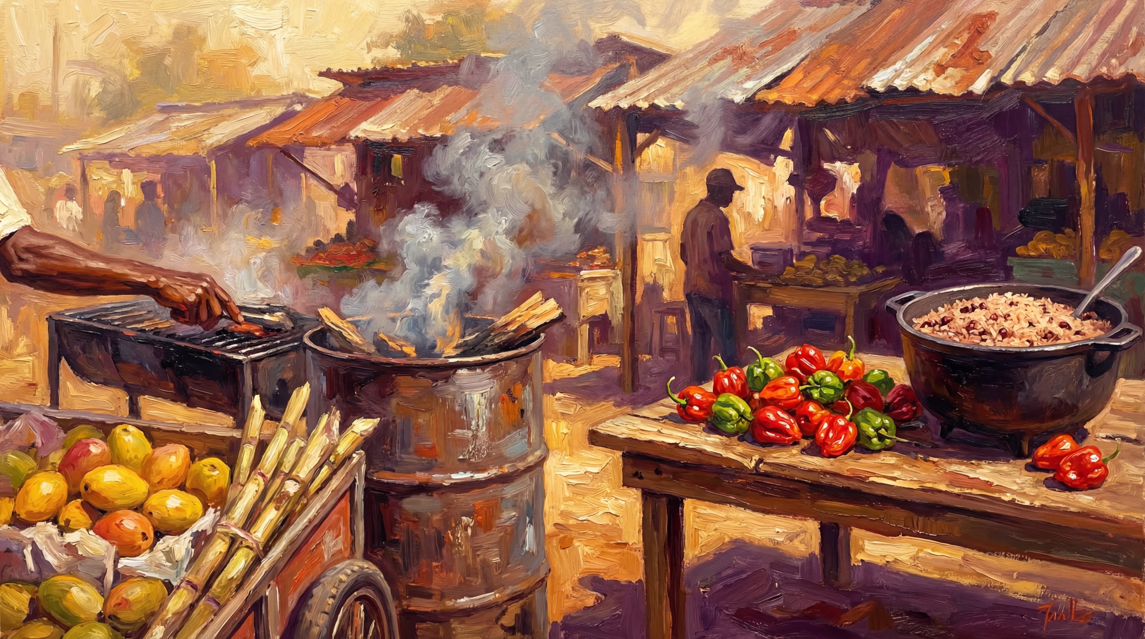 Jerk smoke catch you before you see the drum. Three streets over, thick and sweet and sharp, pimento wood doing what pimento wood does. The air cool just enough to notice. The rum come out. Somebody have a magnum, red stripe or heineken. And it haffi well cold. You eat with your hands. You talk with your mouth full. Regular Tuesday sumn.