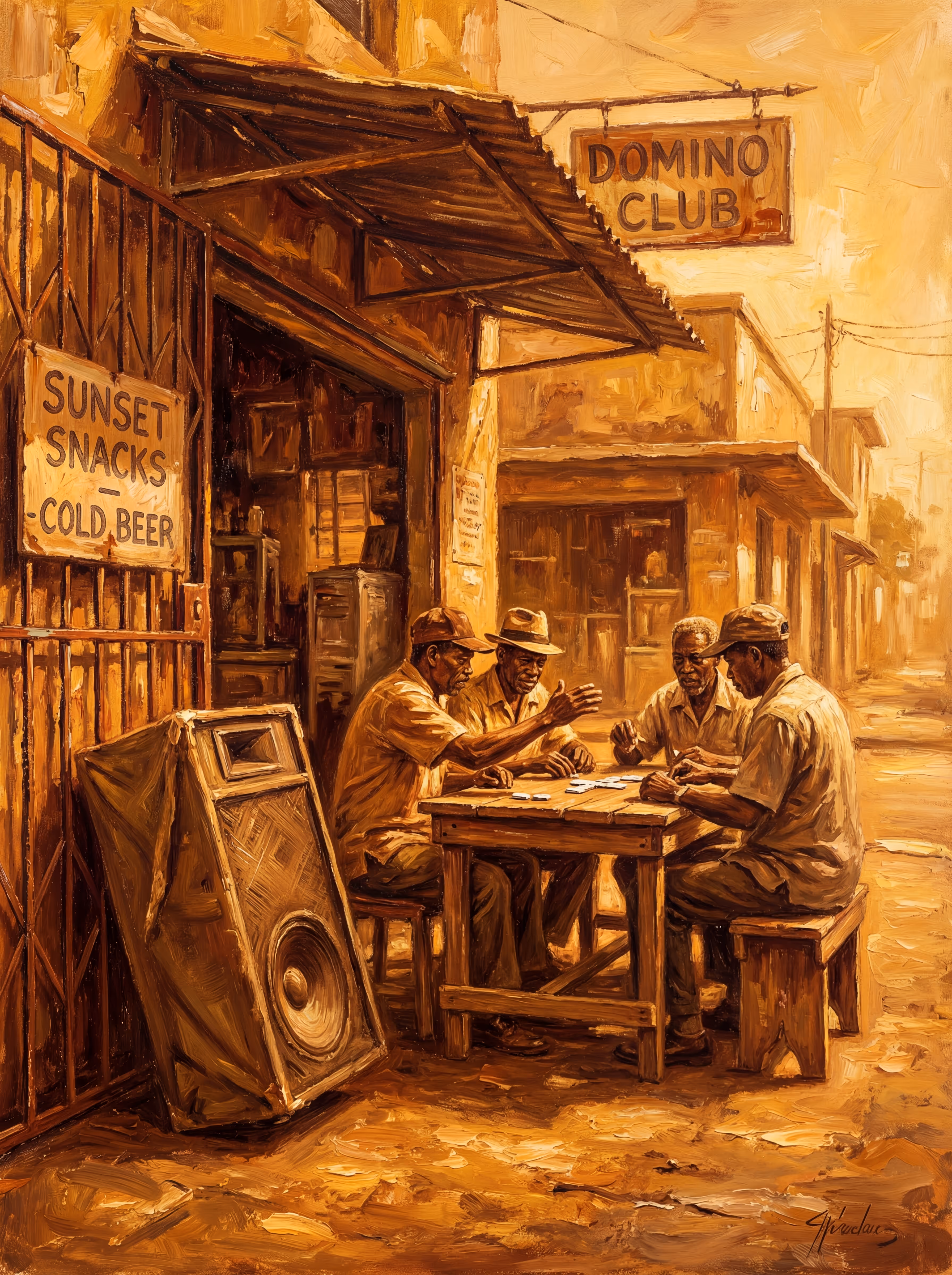 Mid day sun tun up and last so long like it don’t have nowhere fi go. You just hear domino a slam pon table. A speaker box lean against a shop gate playing something with too much bass for this time of day. A bar, a church and a cook shop every km down the road.